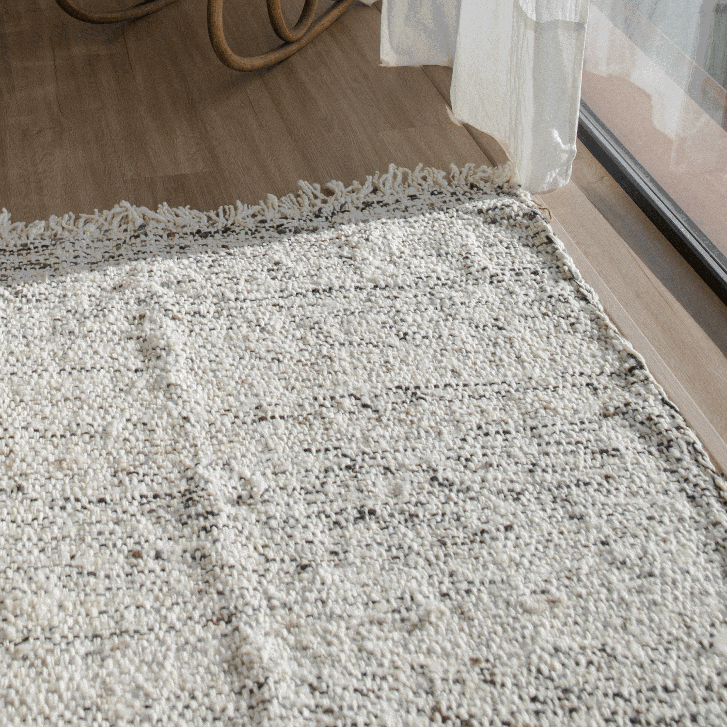 Alfombra tejida a mano con técnicas tradicionales en lana cruda. Hecha en pura lana de oveja con proceso manual desde la esquila hasta la pieza final. Diseño en color melange, mezcla de natural y marrón y terminación opcional con o sin flecos.